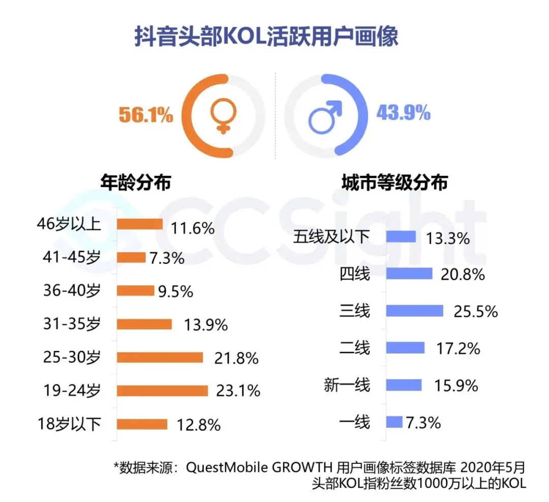 据QuestMobile最新数据显示,抖音头部KOL的男女比例较为均衡,90后、95后最爱看抖音,下沉用户(三四线城市)占比较高,其次是新一线、二线。