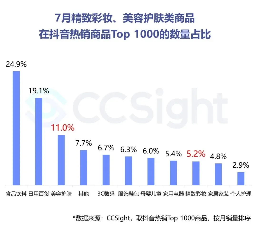 2. 美容护肤类商品在抖音较为热销,仅次于日用百货