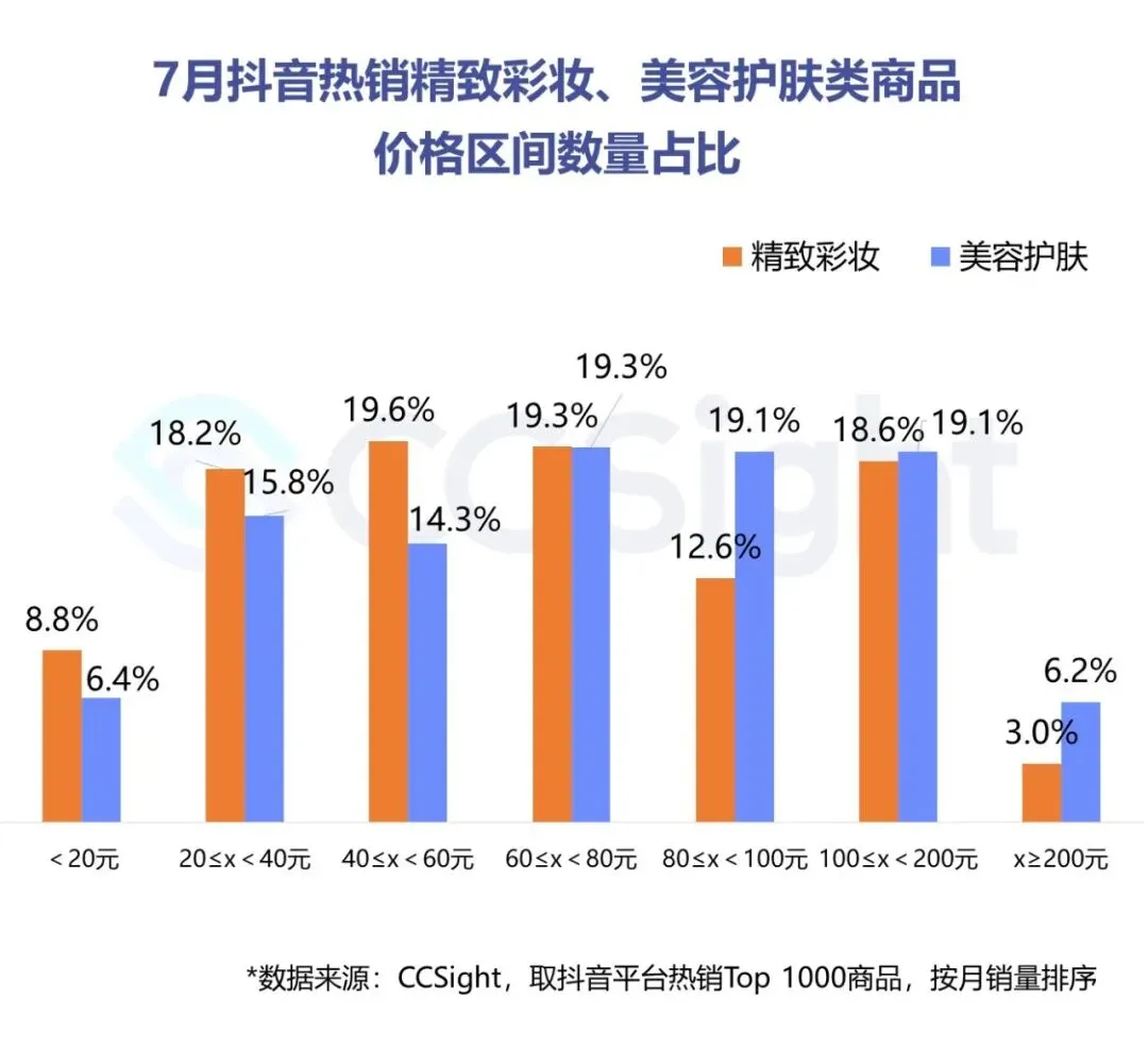 价格处于20-40元、40-60元、60-80元、100-200元区间的精致彩妆类商品数量占比较为接近,在19%左右。