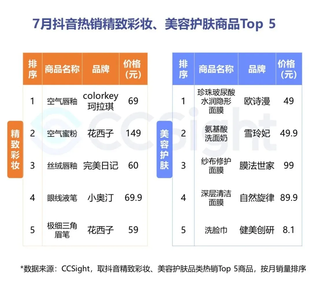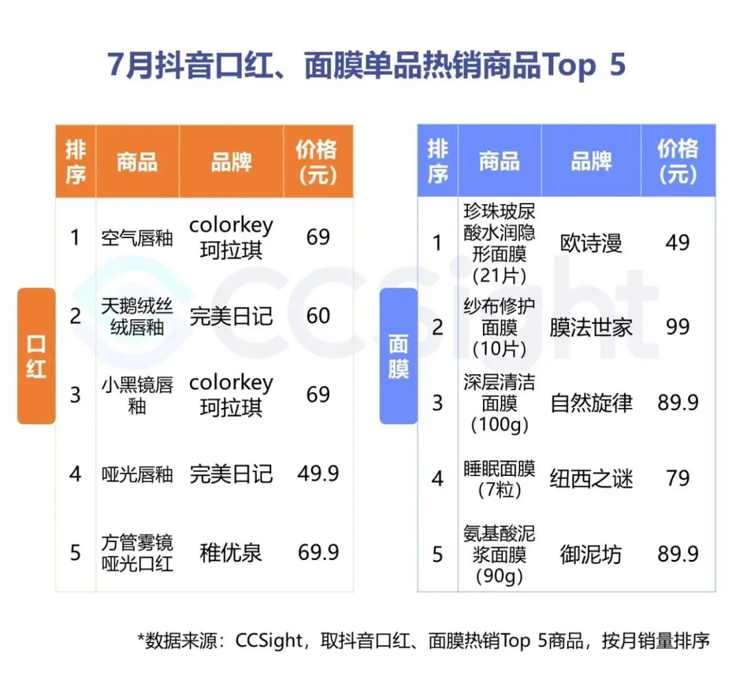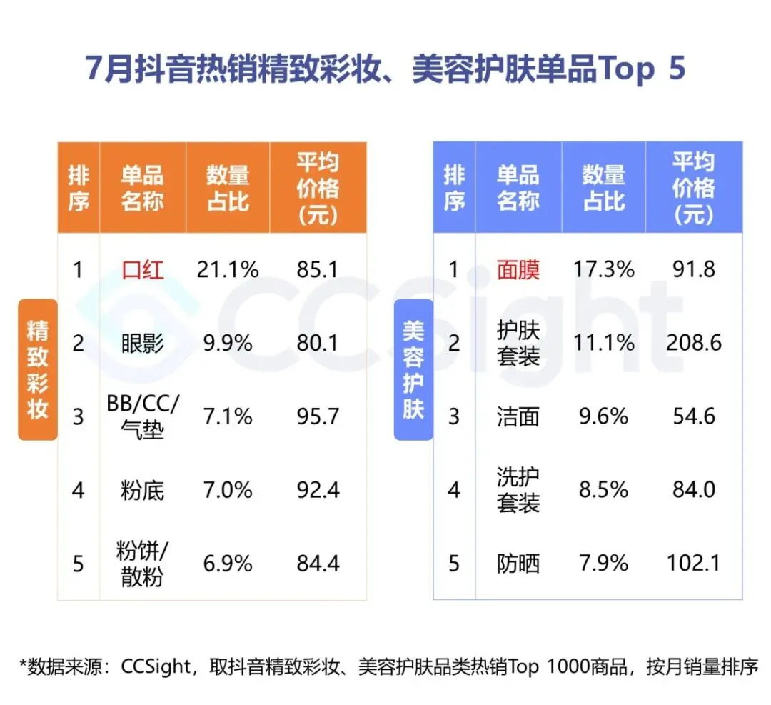 口红、面膜分别成为抖音精致彩妆、美容护肤品类热卖的单品,夏日必备的防晒单品也成为美容护肤品类的热销Top5。