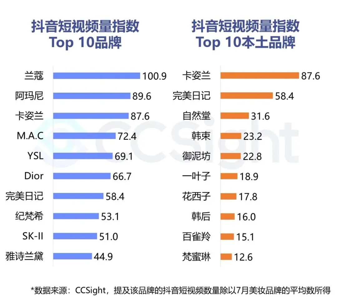 兰蔻、阿玛尼、卡姿兰占据抖音短视频营销的头部阵营,Top 10品牌中仅有2个本土品牌。