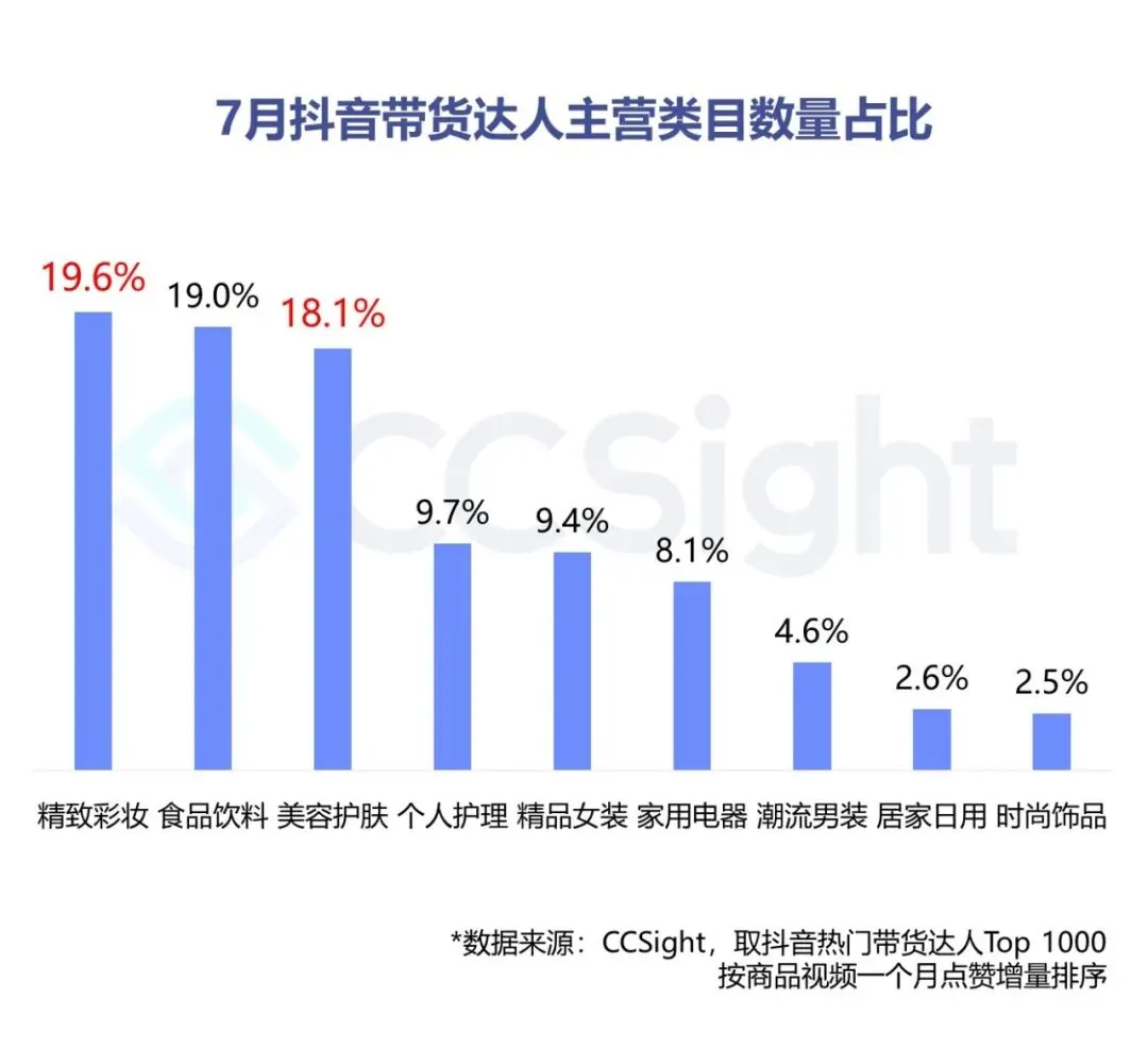 抖音Top 1000热门带货达人中,主营类目为精致彩妆、美容护肤的带货达人数量占比较高,分别占19.6%、18.1%。