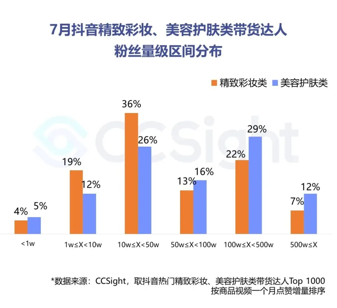 主营类目为美容护肤的带货达人粉丝量级主要处于10w-50w、100w-500w区间,粉丝数超50w的达人数量较多。