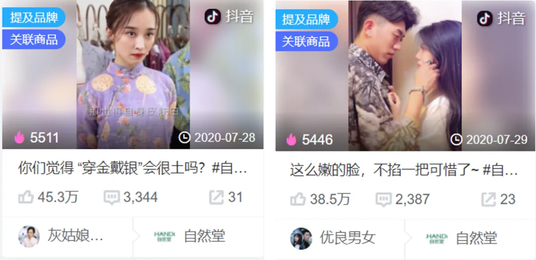 @灰姑娘的裁缝铺给喜欢穿金色衣服的贵妇推荐了“自然堂小紫瓶”,仅在视频尾部用小篇幅内容讲解了其能修复熬夜皮肤肌底的特点,没有破坏整体故事的流畅性,获得了45.3W的高点赞。