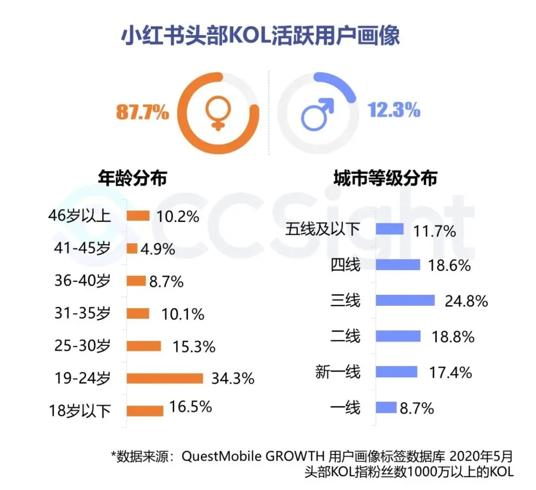 小红书覆盖了当前的主力消费军95后,其中19-24岁占比最高,新一线、二三四线城市用户占比较高。