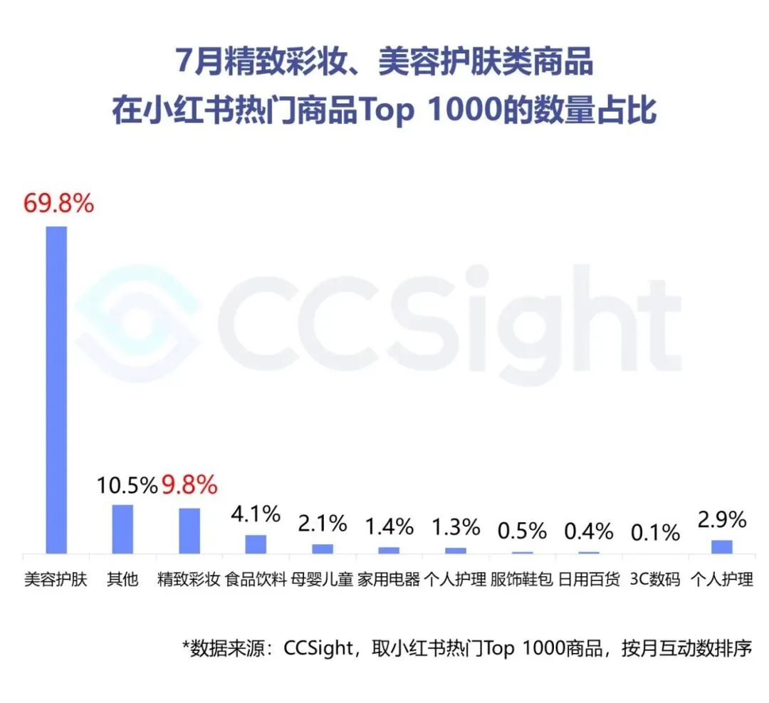 按月互动数排序的Top 1000小红书热门商品榜中,美容护肤类商品数量占比超6成,高达69.8%,说明该品类在小红书最受用户关注,讨论度最高。