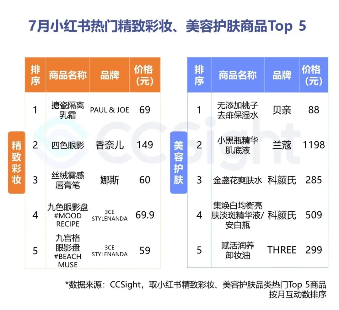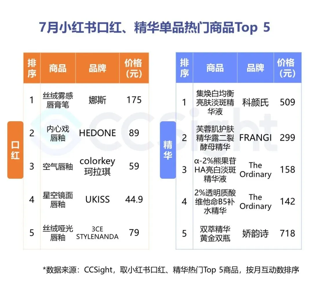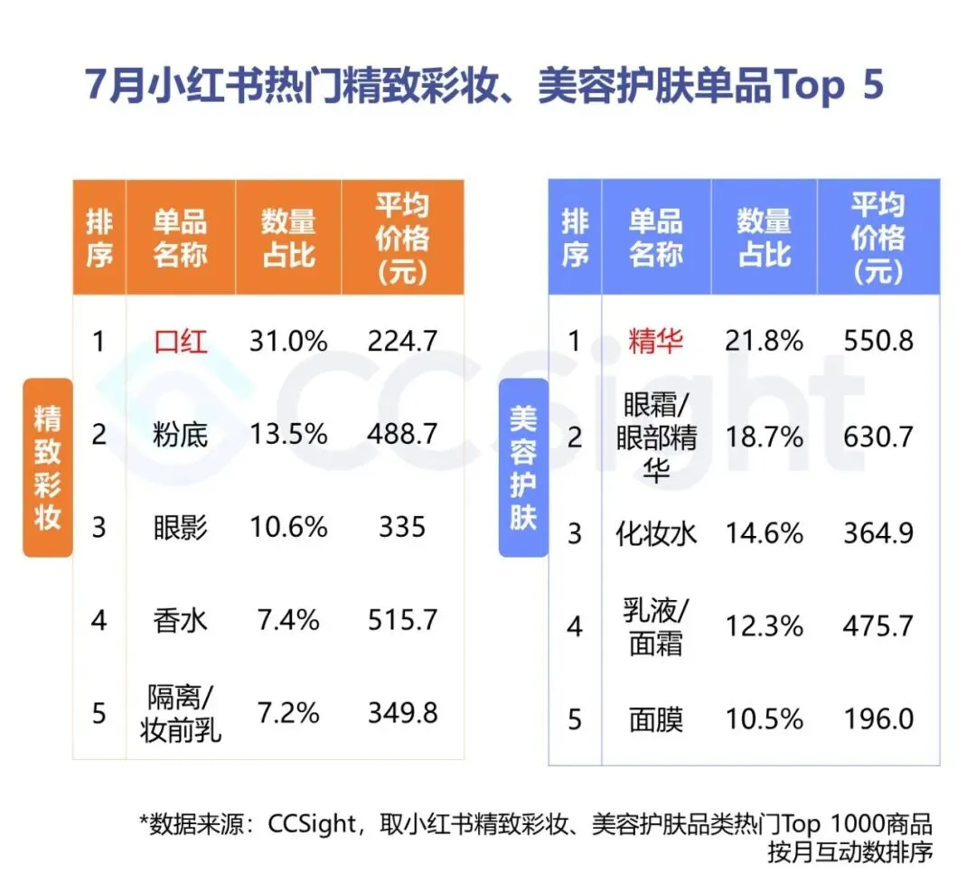 口红、精华分别是小红书精致彩妆、美容护肤品类最热门的单品,在7月份的讨论度最高。