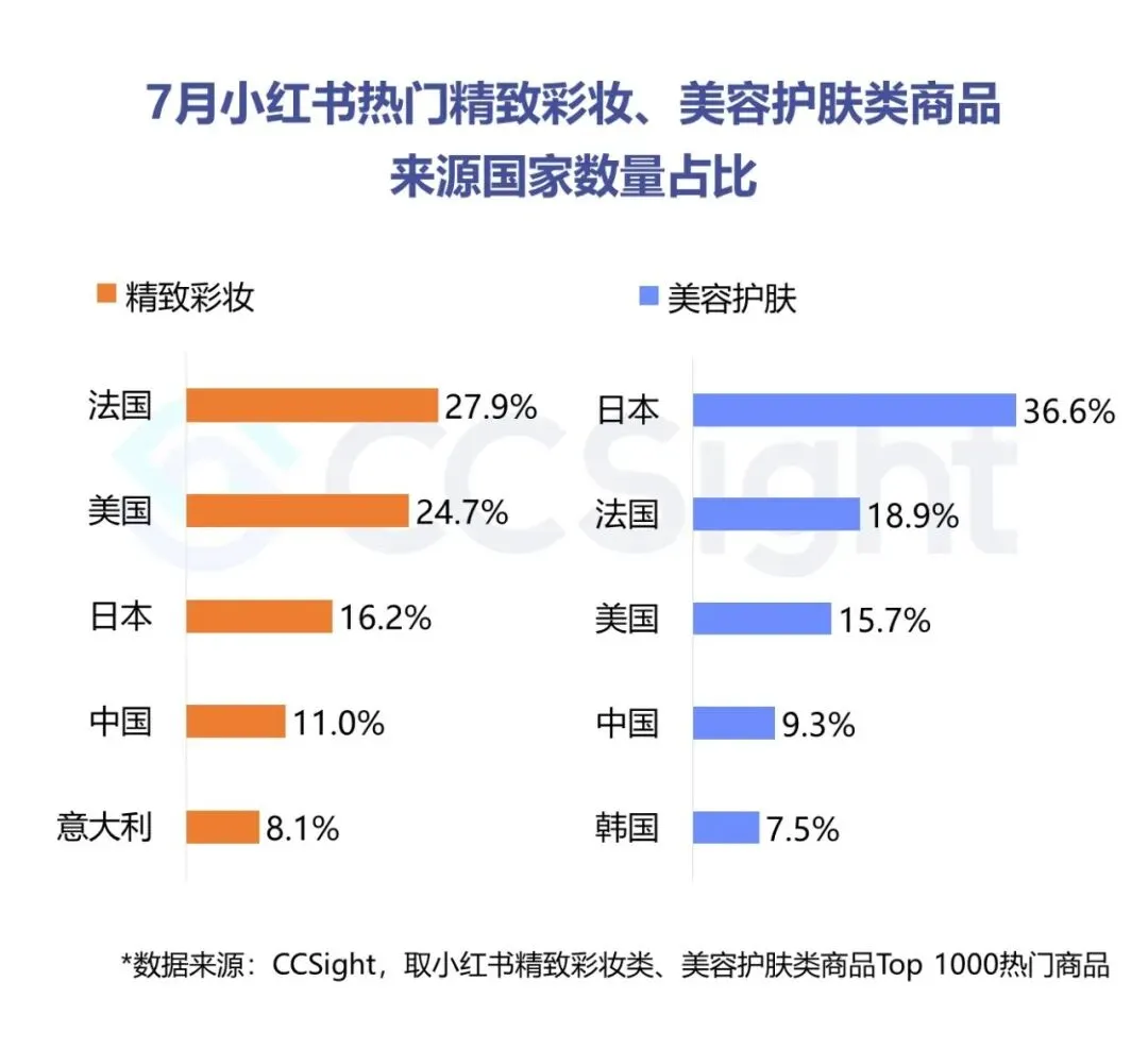 来自法国的精致彩妆商品最多,占比达27.9%,来自日本的美容护肤商品最多,占比达36.6%。