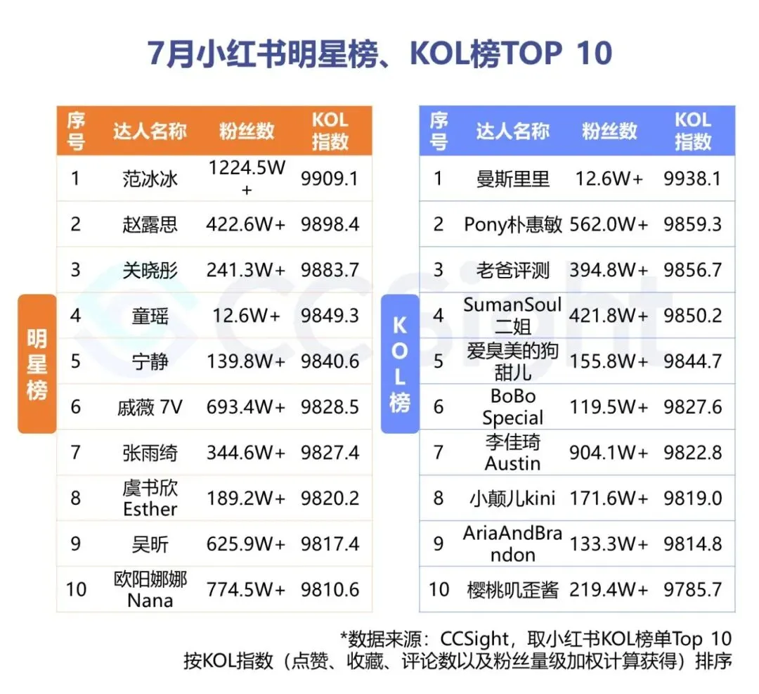 9. 7月份小红书明星榜、KOL榜TOP 10