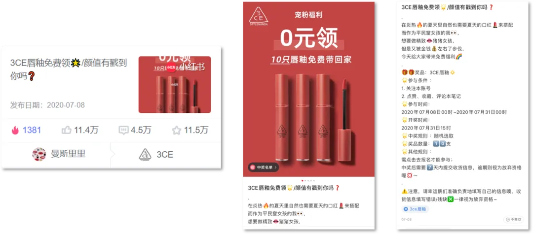 @曼斯里里是一个专门做美妆产品种草的帐号,这是她首次做“0元领”活动,一共拿出10支3CE唇釉来抽奖,引导用户点赞、收藏、评论该笔记来进行抽奖。