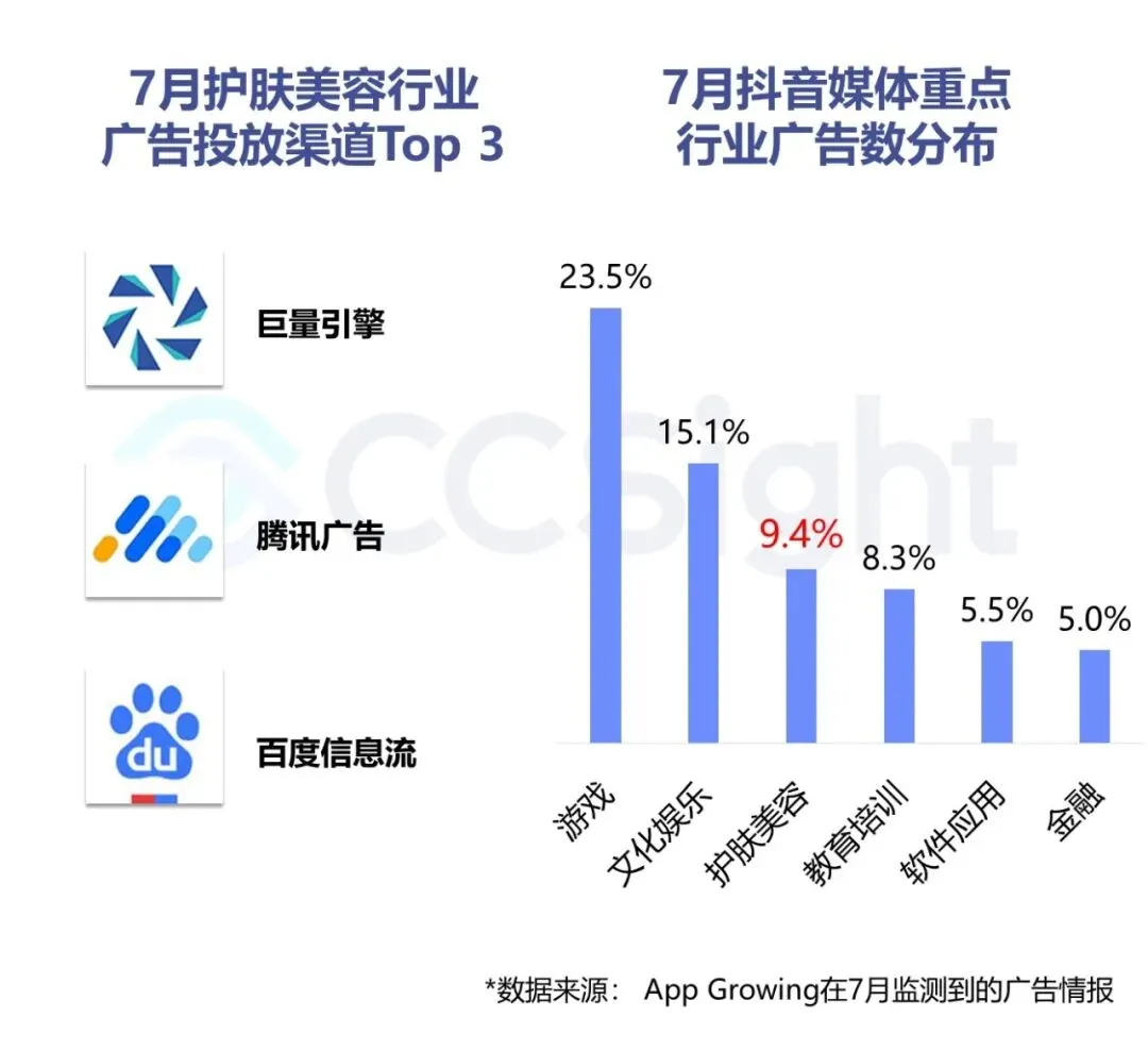 其中抖音媒体渠道的重点投放行业有游戏、文化娱乐、护肤美容等,护肤美容行业广告数占比9.4%。
