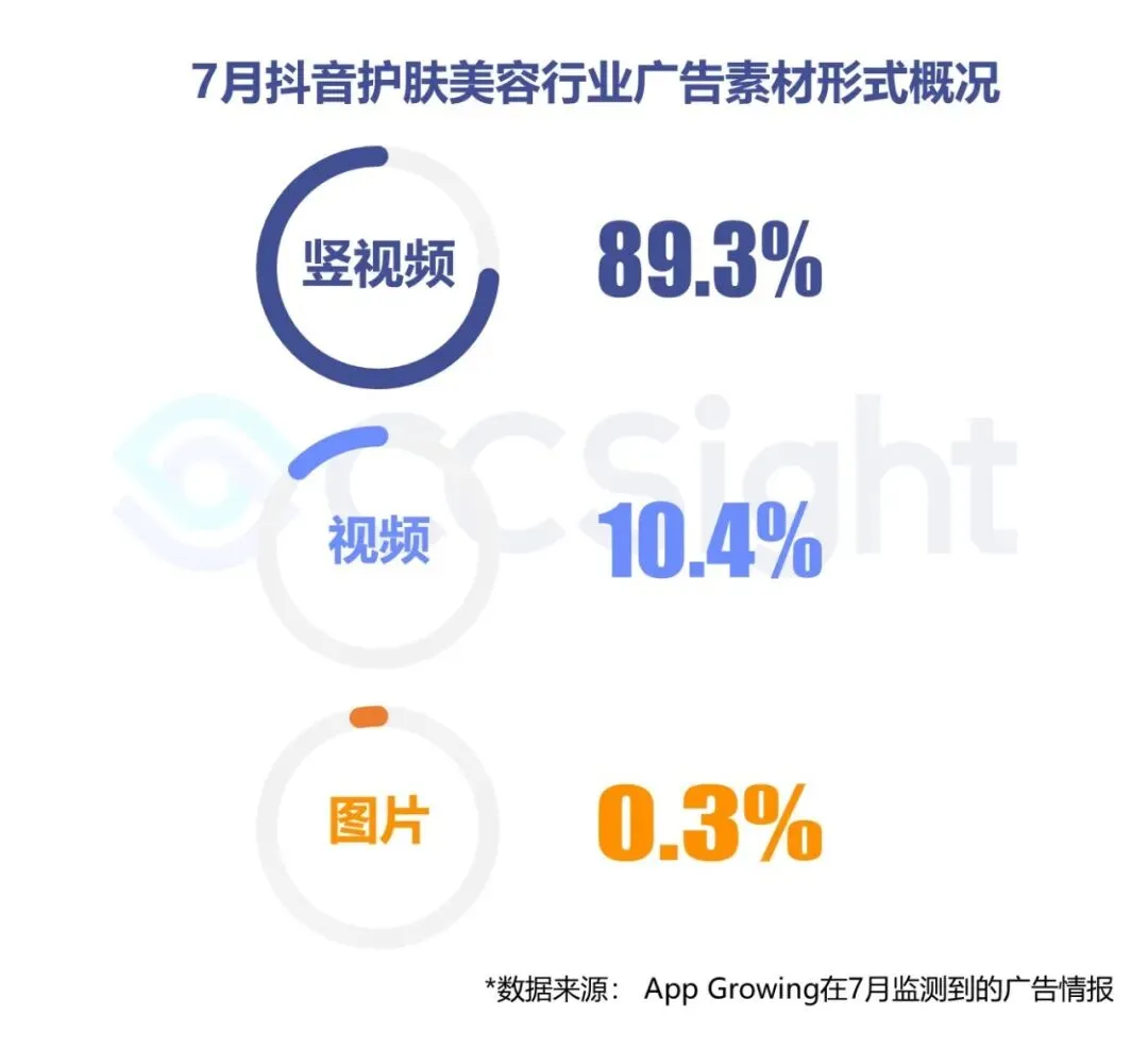 抖音护肤美容行业广告以竖视频居多,占比接近90%,其次是视频形式的素材,占比约为10.4%。