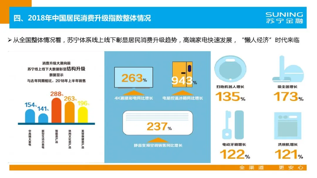 报告显示,我国居民消费升级综合指数加速攀升,从2013年的0.341上升至2018年的0.376,京沪浙苏粤五省市消费升级水平继续领跑全国,消费向发展和享受型倾斜,“懒人经济”时代到来。具体来说,85后与90后已成长为中国新的消费主体,这一“懒人群体”喜爱电子化、智能化、互联网化兼顾娱乐性、趣味性、科技性的家电产品,由此引领了一波个性化、多样化消费需求的兴起。