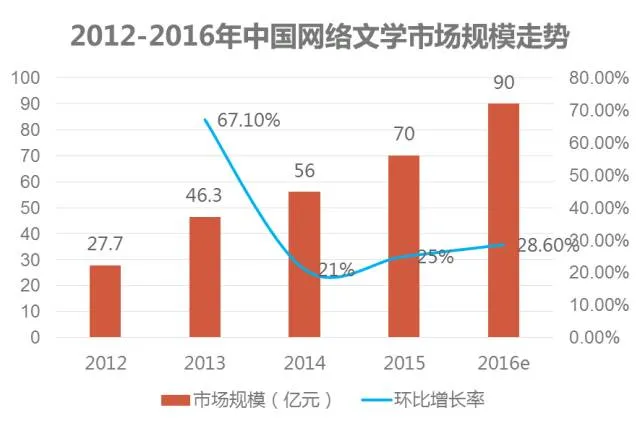 2015年中国网络文学市场规模达到70亿元,环比上涨25%。随着网络文学市场加速发展的时代到来,预计2016年国内网络文学市场可达到90亿元,环比上涨28.6%。2015年互联网巨头争相布局网络文学市场,希望通过改编网络文学产品,向影视作品、手游、动漫等行业扩展。泛娱乐产业的快速发展,拉动网络文学市场的持续高速增长,并给作家带来更多的收益。