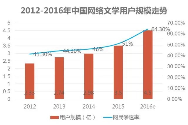 2015年中国网络文学用户规模达到3.5亿,用户渗透率达到51%,渗透率首次过半。预计2016年国内网络文学用户会达到4.5亿人,较2012年,用四年的时间翻了近一倍,届时的渗透率将达到64.3%。众多优秀的网络文学作品被改编成游戏、影视作品,从《何以笙箫默》到《花千骨》,再到《盗墓笔记》《琅琊榜》等作品无不见证了网络文学改编的成功,在成为爆款的作品同时,还给网络文学市场引流,带来更多的读者,进一步提高用户规模。