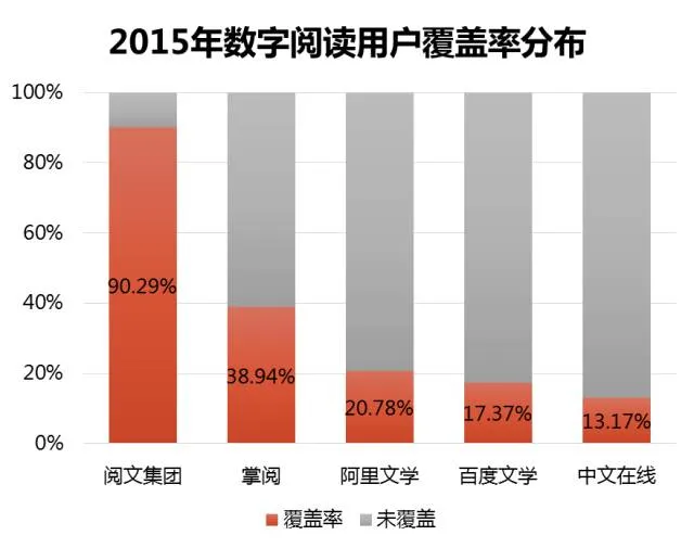在全民阅读的精神指导下,2015年网络文学用户有较大幅度增长,企业数字阅读用户覆盖率也有明显提升。其中阅文集团数字阅读用户覆盖率占比达90.29%,总覆盖率排在第一位;掌阅用户覆盖率达到全行业的38.94%,总覆盖率排在第二位、阿里文学凭借移动端的大力发展,覆盖率达到20.78%,排名第三。