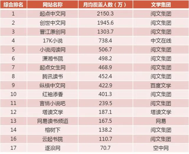中国的网络文学市场呈现一家独大的根本原因,则来自于阅文的强大布局,从起点、创世到红袖添香等网络文学平台,在综合排名前十的网络文学平台中七家都在阅文旗下。而百度凭借着纵横中文网在网络文学的格局中占得一席之地,而至于其他小平台,未来则很难逃脱被大品牌并入的下场。