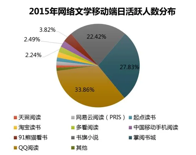 2015年网络文学市场移动端DAU占比最高的是QQ阅读,占比达到33.86%。掌阅书城市场占比27.83%,排在第二位,书旗小说以22.42%的移动端占比排名第三。此外依次还有91熊猫看书、中国移动手机阅读、多看阅读、淘宝读书、起点读书、网易云阅读、天翼阅读等。
