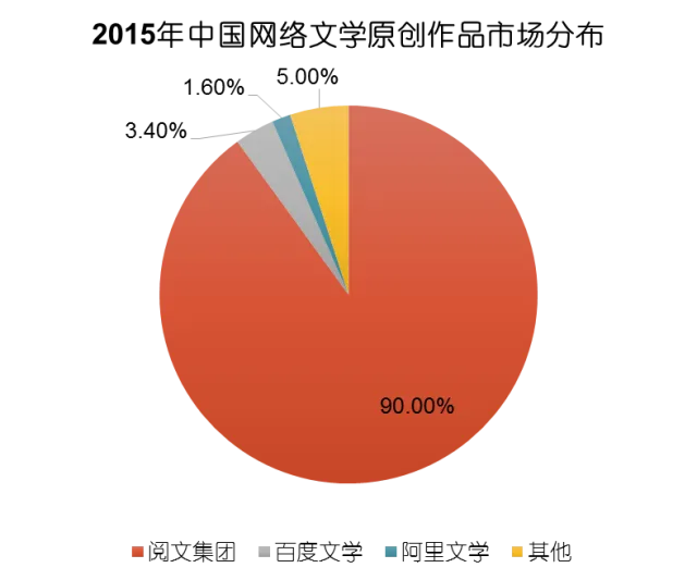 通过2015年中国网络文学原创作品分布可以看出,阅文集团拥有近1000万原创作品,行业占比达90%,成为市场的佼佼者;百度文学市场占比3.4%,排在第二位;阿里文学市场占比1.6%,排在第三位。