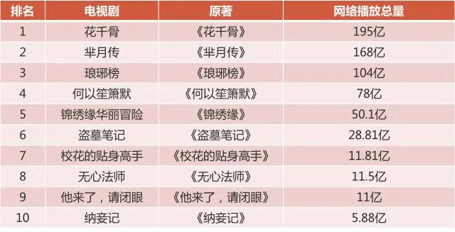 主流趋势下,文学作品的版权逐渐受到重视,众多优秀的网络文学作品被改编成游戏、影视作品,从《何以笙箫默》到《花千骨》,再到《盗墓笔记》《琅琊榜》等作品无不见证了网络文学改编的成功,网文IP改编剧表现不俗,网络点播名列前茅。