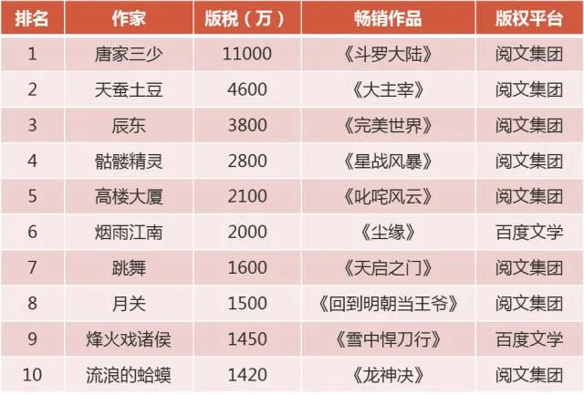2016年第十届中国作家富豪榜公布了“网络作家榜”入选名单,榜单前十名的作者版税收入均已过千万,唐家三少更是以超亿元的版税收入再次蝉联网络作家排行榜榜首。