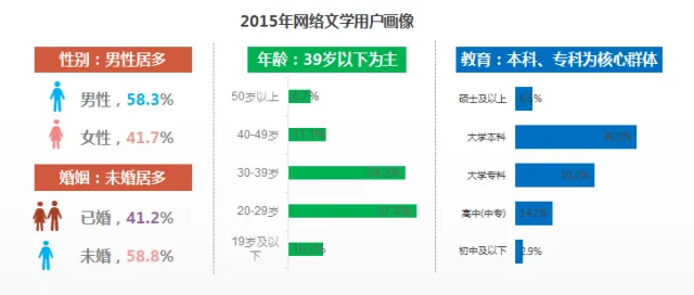 年龄方面,20-39岁年龄区间覆盖了七成以上的网文用户;教育方面,本科学历占比最高,为46.2%。
