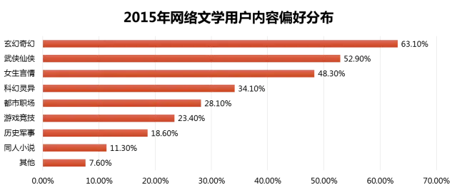从国内网络文学用户的内容偏好上看,用户则更趋向于在玄幻、仙侠类的小说集中。因为中国网络文学用户以男性为主,有较多的武侠、奇幻情节,再加上一部分喜好此类小说的女孩,便形成了网络小说界玄幻为王的局面。