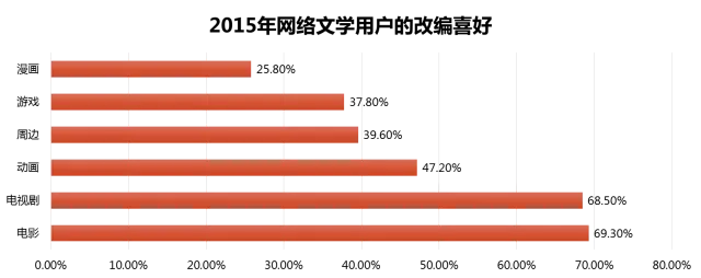 2015年是IP爆发的一年,大量的优秀作品走出文字,衍生出新的商业价值。从网络文学用户对内容的改编认同程度上看,电影和电视剧改编的支持率最高,分别得到了69.3%和68.5%的用户认同,其次是动画、周边、游戏等。
