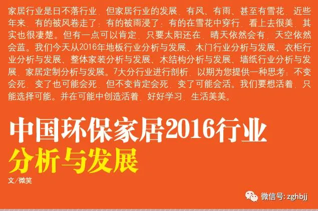 我们今天从2016年地板行业分析与发展、木门行业分析与发展、衣柜行业分析与发展、整体家装分析与发展、木结构分析与发展、墙纸行业分析与发展,家居定制分析与发展。7大分行业进行剖析,以期为您提供一种思考:不变会死,变了也可能会死,但不变肯定会死,变了可能会活。我们要想活着,只能选择可能。并在可能中创造活着,好好学习,生活美美。