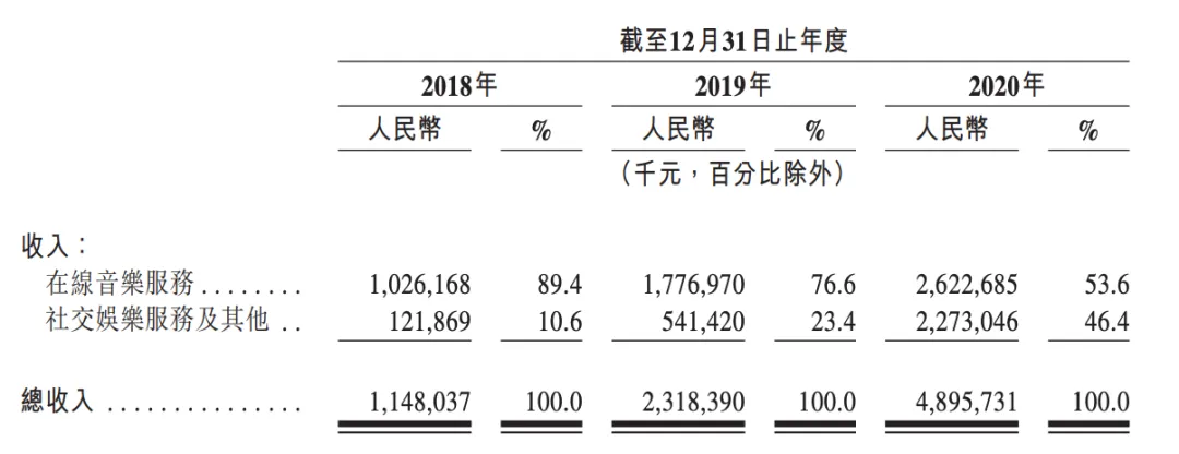 相比音乐用户,社交用户通常会贡献更多的平均单位收入(ARPU),所以,音频直播才会“贡献了重要的营收增长”。而招股书的数据显示,社交娱乐服务及其他收入占总收入的46.4%。2018年10月推出的直播业务增长迅猛,其中音频直播同样持续位居行业第一阵营。