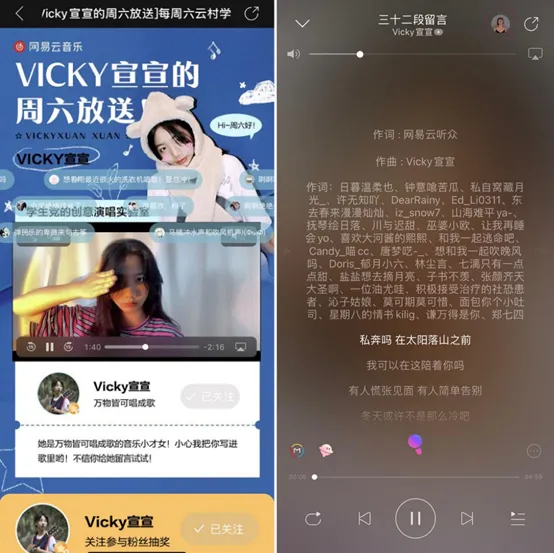 在网易云音乐上,Vicky宣宣靠发布个人音乐作品,拥有了将近50万粉丝;乐评人陈北及,通过发布播客和制作歌单,也有10万粉丝。个人简介是“做好剪辑,剪好故事”的普通用户猫背君,靠发布Mlog(短视频),目前也积累了超过3万粉丝。