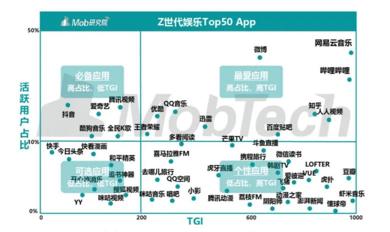 好在音乐的复苏正好也赶上了“Z世代”(95-00后)的崛起,作为互联网的原住民,他们天然的亲近网络社区,也更熟悉互联网创作和互动。而且,相对较年轻的网易云音乐又深受年轻人的青睐。据Mob研究院《Z世代大学生图鉴》,网易云音乐以高活跃用户占比和高TGI(偏好度)成为最受Z世代大学生欢迎的娱乐APP。在中国年轻一代中,网易云音乐已是一个被广泛认可和欣赏的文化符号。