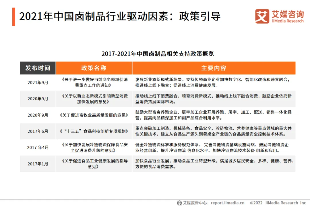 近几年中国加强了对食品消费的全方位扶持政策,从促进消费、引领新型消费发展、提高畜牧业发展质量、推动食品科技创新、发展冷链物流及促进食品工业健康发展等方面给予了明确指引。艾媒咨询分析师认为,国家对于食品消费的支持政策不断加强,有利于卤制品行业的健康运行与发展。