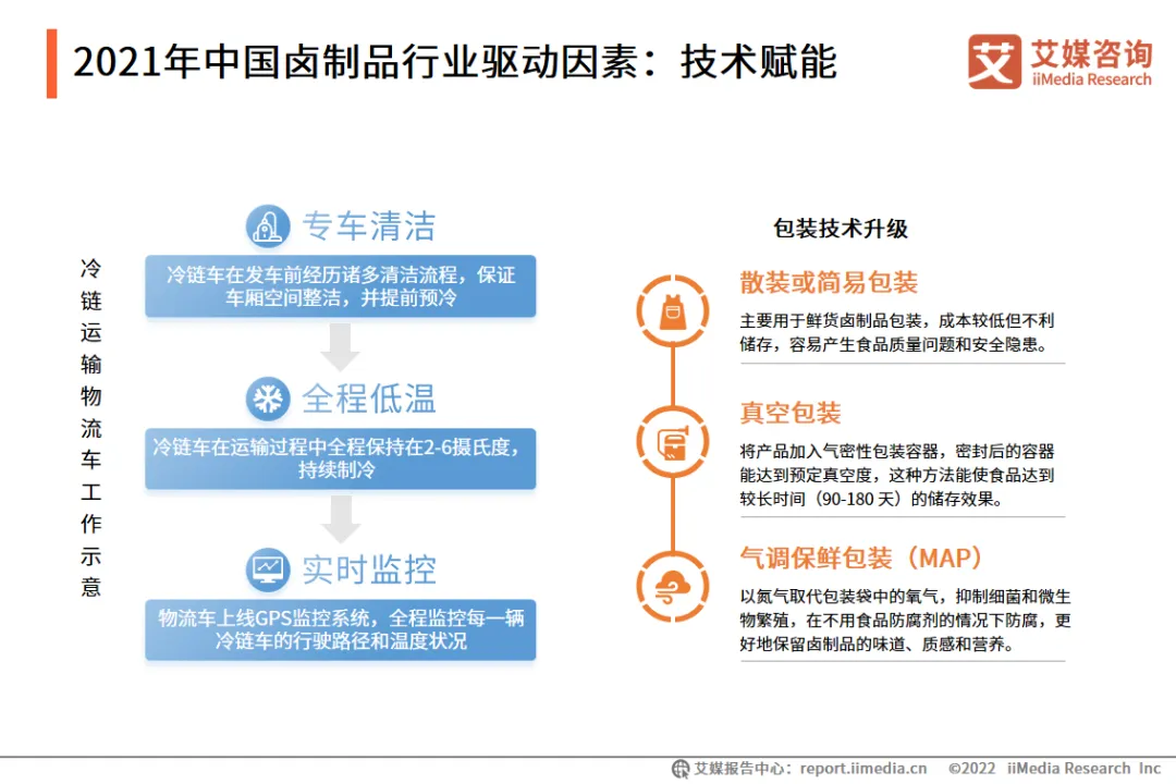 随着国民收入水平的普遍提高以及消费升级的到来,“Z世代”群体愈发成为消费市场的重要力量。调研数据显示,2020年中国“Z世代”经常买快销食品的人占比37.3%,在购买快销食品中消费卤制品的比例达34.0%。艾媒咨询分析师认为,创新型、差异化的卤制品品牌将更能吸引“Z世代”群体。卤制品行业的发展离不开技术升级的助力,冷链运输体系的成熟应用,推动了卤制品行业生产端标准化和规模化,延长了产品的保鲜期,拓展了零售端的触及范围;包装升级加速了卤制品多渠道展开、线上线下融合的进程,为预制菜等形式提供了实现基础,在疫情常态化中为零售端获得新的消费增长机会。