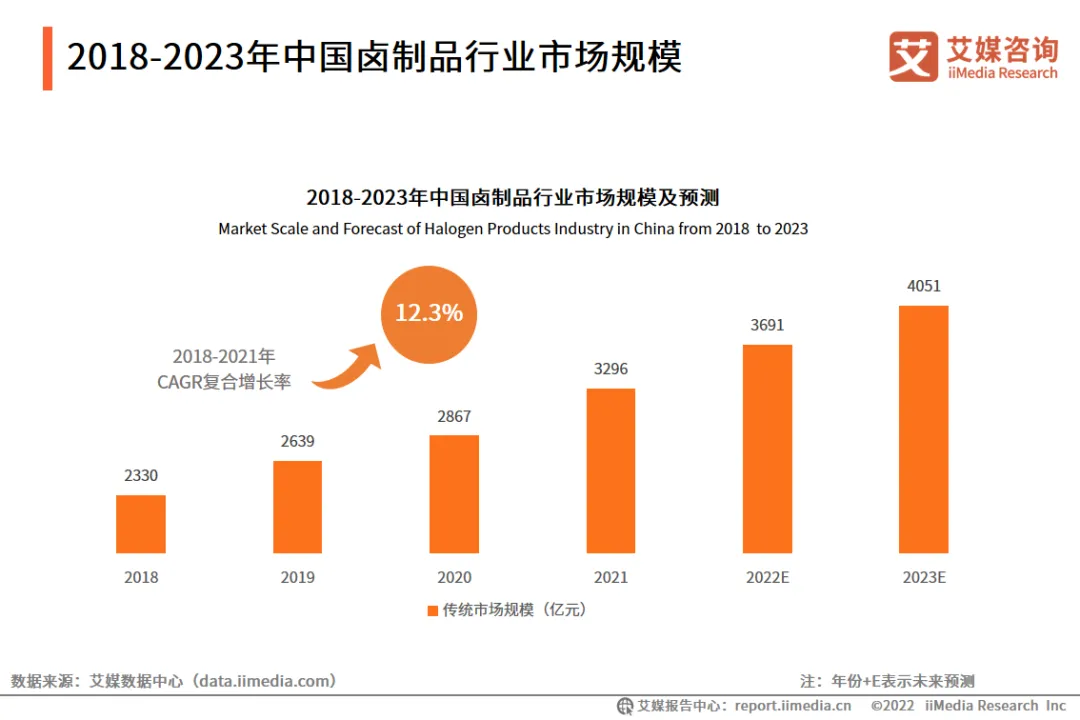 iiMedia Research(艾媒咨询)数据显示,2021年中国卤制品行业规模达3296亿元,2018-2021年复合增长率为12.3%。艾媒咨询分析师认为,随着国民生活水平不断提升以及消费需求的扩大,卤制品消费场景日益增多,推动行业进一步发展,预计2023年中国卤制品行业规模达4051亿元。