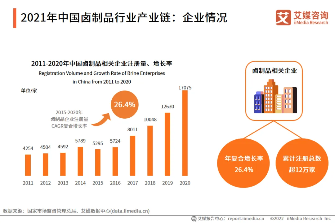 数据显示,截至2020年我国卤制品相关企业总注册量已经超过12万家,2011-2020年中国卤制品相关企业注册量整体呈上升趋势,从2015-2020年出现了新增长,期间年复合增长率达到了26.4%。艾媒咨询分析师认为,市场上涌入了大量新企业,为中国卤制品行业发展持续注入动力。
