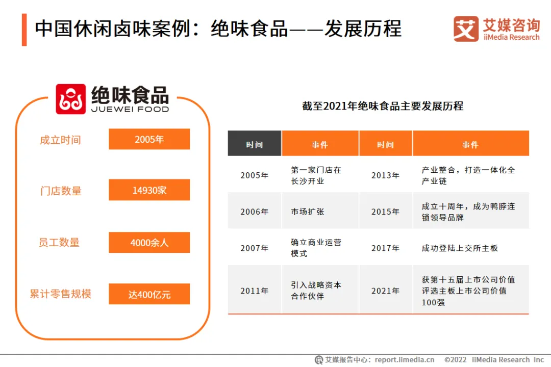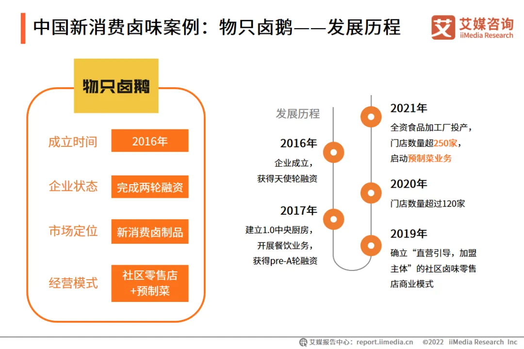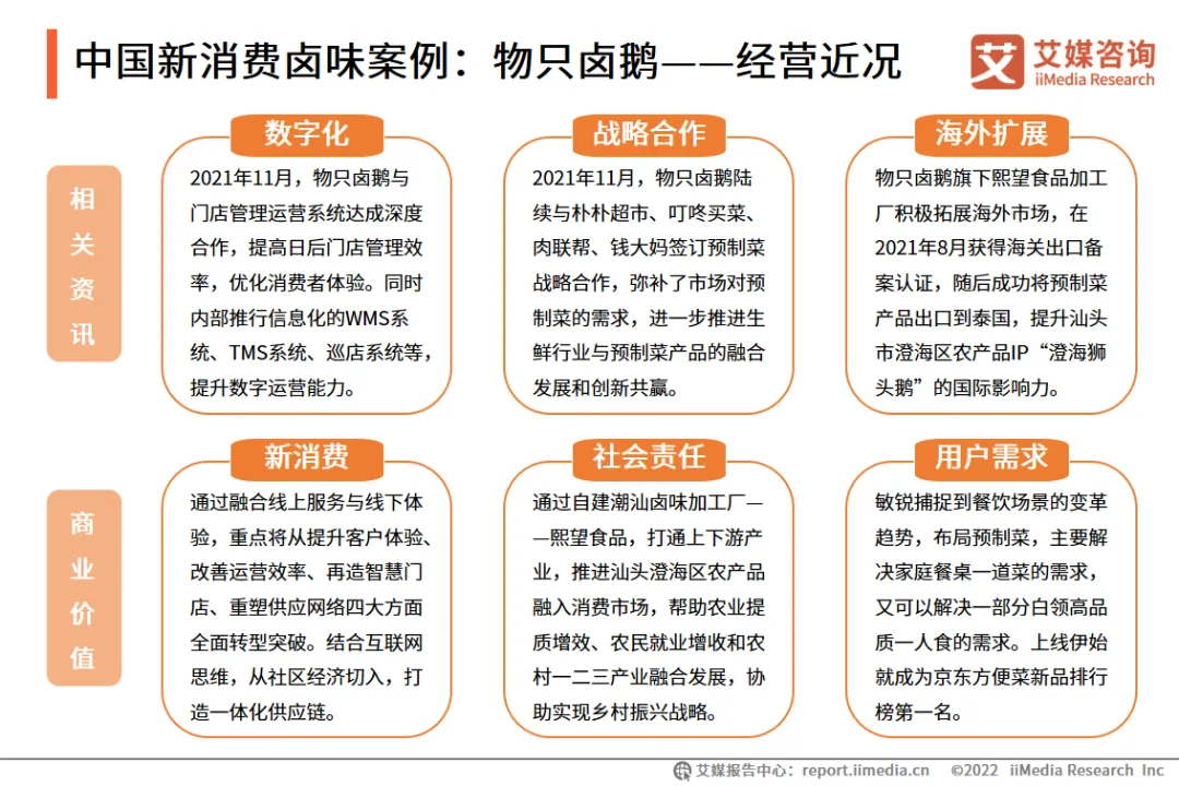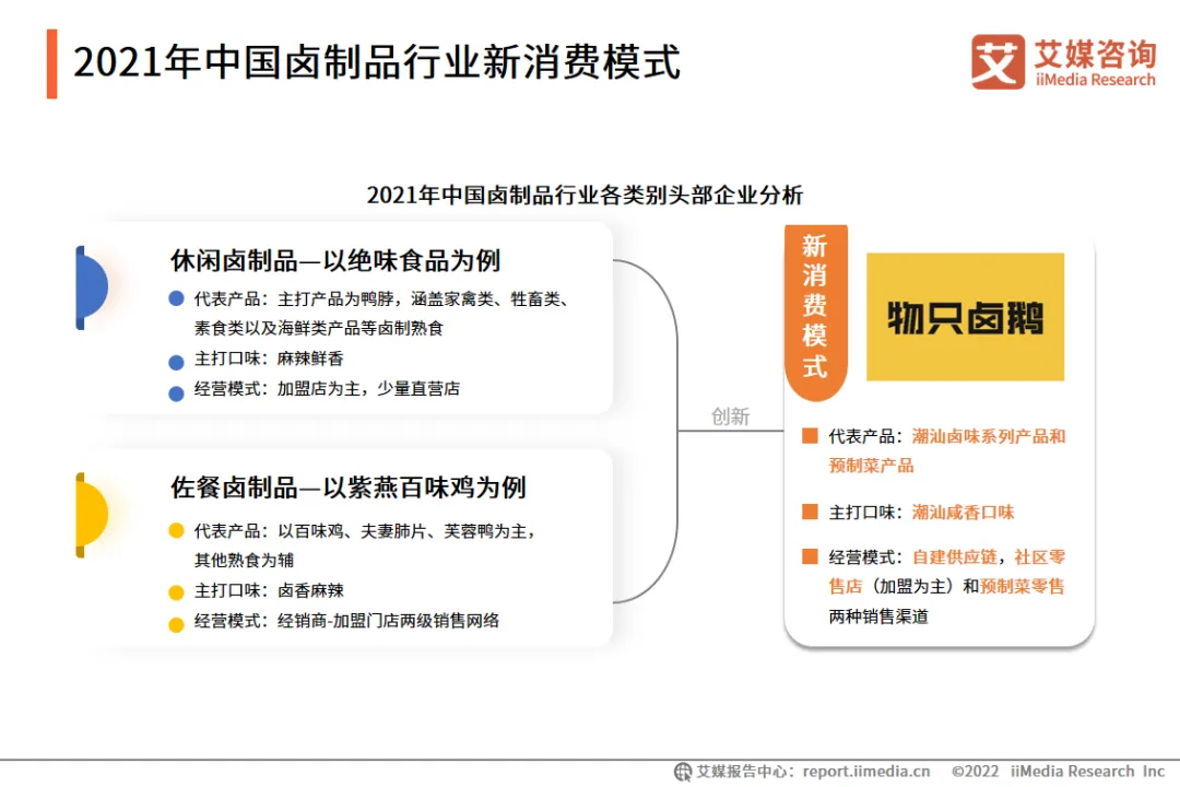 绝味食品成立于2005年,是一家以休闲卤制食品的生产和销售,以及连锁加盟体系的运营和管理为主营业务的公司,为国内现代化休闲卤制食品连锁企业领先品牌。紫燕发源于四川,公司产品以川卤口味为基础,揉合粤、湘、鲁众味,主要定位佐餐消费。公司从产业上游到下游全方面布局,在原材料端与温氏股份等龙头企业合作,供应链达到当日或次日达的要求,下游渠道形成以遍布全国4300多加门店为主的多样化营销网络,在行业内建立了一定优势 。物只卤鹅是一家专注潮汕卤味品类的新消费企业,主要业务有食品工业、连锁社区店和预制菜三大版块,拥有2个食品加工厂和250多家连锁社区店,预制菜已实现国内一线电商平台上线和出口贸易突破。目前物只卤鹅估值达数亿元人民币。物只卤鹅在发展初期便深耕供应链整合,不断布局沉淀,目前实现了集专业研发、一流品控和标准化生产于一体的供应链体系,并开拓了预制菜业务。经历了四年实践,物只卤鹅最终瞄准社区经济,在2020年正式以社区店作为大规模发展的店型,满足社区家庭餐桌和一人食等场景下的卤味熟食消费需求。中国卤制品行业市场集中度一直以来偏低,市场呈高度分散的状态。即便卤制品巨头企业也曾曝出过食品安全问题,其余企业更加难以保证其品质,食品安全问题将阻碍整个行业的长期发展。新消费卤制品企业如物只卤鹅,通过整合供应链体系,从各个环节确保食品安全,推动了中国卤制品行业的健康发展和行业标准体系的完善。中国卤制品行业经营模式以直营和加盟为主,直营带来高管理成本以及扩张缓慢的问题,加盟可能带来品牌声誉受损及维护成本过高的问题。各个龙头企业都在结合公司自身特点探索符合未来发展的新道路。新消费卤制品企业如物只卤鹅,通过预制菜模式将佐餐卤制品推广到线上和商超等,使得下游渠道拓展更加便利,产品品质更有保障。休闲和佐餐卤制品市场空间广阔,仅仅是休闲卤鸭制品市场已经诞生了三家上市公司,但消费者对于卤制品产品的种类和口味需求是多元的,以单一产品占据消费者心智的品牌始终将触及快速增长的瓶颈。近年来中国卤制品行业垂直细分赛道获得资本市场关注,新消费卤制品企业将获得更加快速的成长。1、 产品细分:传统卤制品地位牢固,新消费产品开拓新赛道随着消费结构升级和资本力量推动,卤制品市场涌现了众多新消费品牌,产品品类包括潮汕卤鹅、冷锅串串、预制菜和热卤小吃等。传统卤制品扎根大众市场,经营历史悠久,零售覆盖面广,行业已出现龙头企业;新消费品牌定位垂直细分市场,以新产品、新口味、新体验吸引人群消费。传统卤制品市场和新消费卤制品赛道,将一同推动中国卤制品行业市场规模增长,加速品牌化进程。2、渠道拓展:线下门店数量场景齐扩张,线上渠道多线布局传统卤制品龙头企业紧锣密鼓地开设线下销售网点,立足社区周边,并与商超、便利店、餐饮场所等渠道达成合作,部分新消费品牌将卤制品门店开进了商场,拓展了线下消费场景;除了线上网购电商,直播电商、社区生鲜电商的兴起让卤制品企业看到了新的引流和转化机会,瞄准新世代年轻群体的消费潜力。行业渠道的拓展有利于龙头企业的市场集中度提高,以及垂直细分市场的发展,共同促进行业繁荣。3、数字化赋能:推动数字化建设,提升卤制品企业核心竞争力随着行业竞争加剧和企业增长带来的管理问题,各企业内部涉及层级多、链条长、沟通频繁,各环节信息难以实现精细化管理,降低了运转效率,对响应市场变化存在滞后性。新时代下以大数据和数字化运营为基础,卤制品企业融合产业链多种形式的信息,获得更先进的数字运营能力,从而提升管理水平和执行力,达到降本提效的目标,是当下卤制品行业的发展趋势。4、聚焦Z世代:消费升级时代,“Z世代”成为卤制品市场消费主力“Z世代”群体已成为不可忽视的新消费主力军,消费理念不同于传统人群,更重视个人需求的即时满足,追求新潮流、高品质。以物只卤鹅为代表的新消费卤制品,在消费升级背景下,通过迭代创新提供健康优质的鲜卤产品,并推出预制菜产品,满足社区家庭餐桌和一人食等场景下的卤味熟食消费需求。商务合作:大筝 / 18923764126(微信同号)免责声明:本文的提供资料部分来源网络,仅供用户浏览,但我们无法确保信息的完整性、即时性和有效性。若在使用过程中产生的侵权纠纷等问题,请及时联系删除,对此不承担任何责任。