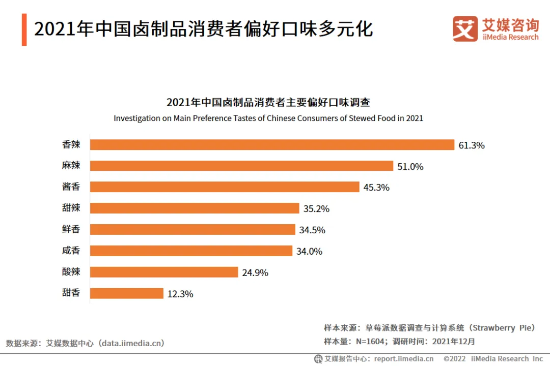 调研数据显示,有96.6%的消费者购买过卤制品,其中有43.9%的消费者表示非常喜欢,有48.4%的消费者表示喜欢。艾媒咨询分析师认为,卤制品种类、口味丰富,购买便捷,适用场景广泛,受到大部分人喜欢,且单价普遍较低,大众普遍可以接受,因此卤制品消费者人群数量较多。调研数据显示,中国卤制品消费者最喜欢的是香辣口味(61.3%),其次是麻辣(51.0%)口味。艾媒咨询分析师认为,传统卤制品以香辣、麻辣为主要特色吸引消费者,随着消费者对卤制品口味需求趋向多元化,酱香、鲜香、咸香等口味的偏好比例均超三分之一,主打酱香、鲜香、咸香差异化口味的新消费卤制品企业有机会开拓细分赛道。