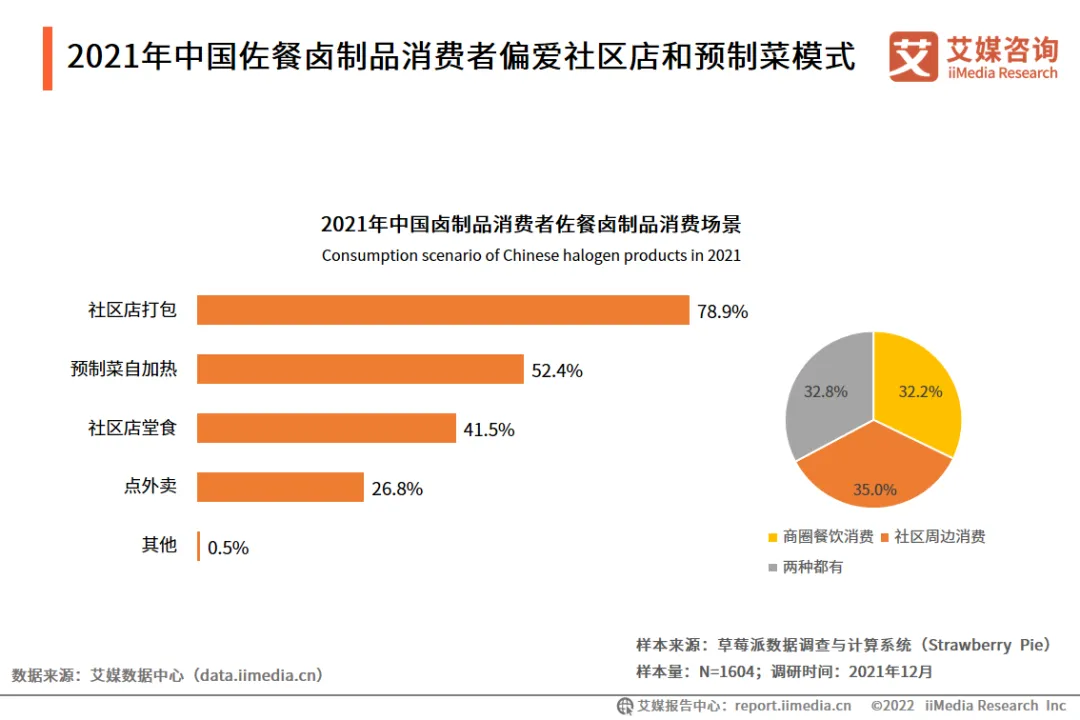 2021年中国佐餐卤制品消费者偏爱社区店和预制菜模式调研数据显示,消费者在商圈和社区周边消费佐餐卤制品的比例基本相等。在社区周边消费时,选择在社区店打包的比例最高(78.9%),其次是预制菜自加热(52.4%)和社区店堂食(41.5%)。艾媒咨询分析师认为,相对于外卖,社区店食品和预制菜的品质和安全更有保障,满足了消费者对健康优质餐饮的需求。