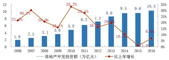 随着供给侧结构性改革不断深化,2015年全国房地产开发完成投资比上年仅增长1%,投资规模近9.6万亿元,基本与上年持平。进入2016年投资形势有所好转,全年房地产开发投资10.3万亿元,比上年增长6.9%,但与上年同期相比投资增长均未过10%。