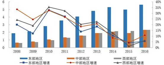 从区域上看,东部地区依然是房地产投资的主要区域。2016年我国东部地区完成房地产投资5.6万亿元,高于中西部房地产完成投资的总和;东部地区仍是房地产投资的主要区域,给建筑设计企业带来的业务机会也更多。然而,2014年前中西部房地产完成投资增速普遍高于东部地区,2015年中西部房地产完成投资增速减缓,但2016年中西部房地产完成投资增速依然高于东部地区,未来中西部发展速度会继续高于东部地区。