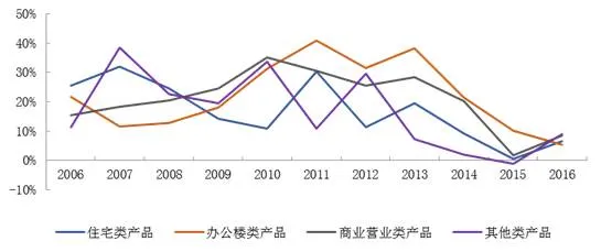 从产品类别上看,住宅、办公楼、商业营业类投资增长普遍放缓。