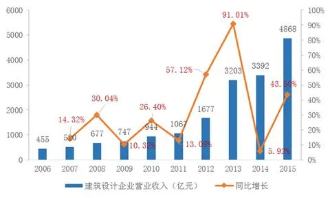 近年来,受益于城镇化进程的推进,我国建筑设计行业发展迅速,队伍数量、经营规模、管理水平和经济效益均得到了较快发展。2010-2014年,整体呈现增长态势,但增幅不稳,受宏观经济增速放缓、房地产行业景气度下滑等因素的影响,2014年建筑设计企业的营业收入增长速度大幅度下降,2015年增幅有所回升,但仍未恢复之前较高水平。