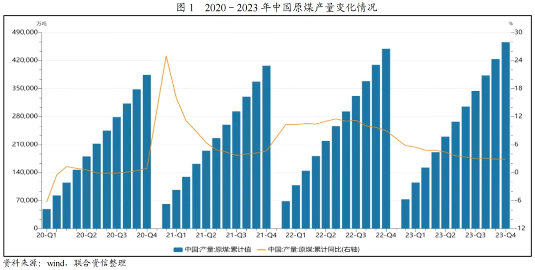 中国原煤供给以国内为主、进口为辅。据国家统计局数据,2023年全国规模以上煤炭企业原煤产量46.58亿吨,同比增长2.90%。随着2021年以来的煤炭增产保供政策带来的新增产能逐步充分释放,全国原煤产量增速较上年明显放缓。进口煤方面,2023年以来,中国自蒙古国的煤炭进口量明显增加;2023年2月后澳洲煤炭进口逐步全面放开,俄罗斯煤炭供应亦明显增加,使得中国煤炭进口量整体规模大幅增加。根据海关总署公布的数据,2023年,全国累计进口煤炭(煤及褐煤)4.74亿吨,同比显著增长61.80%。