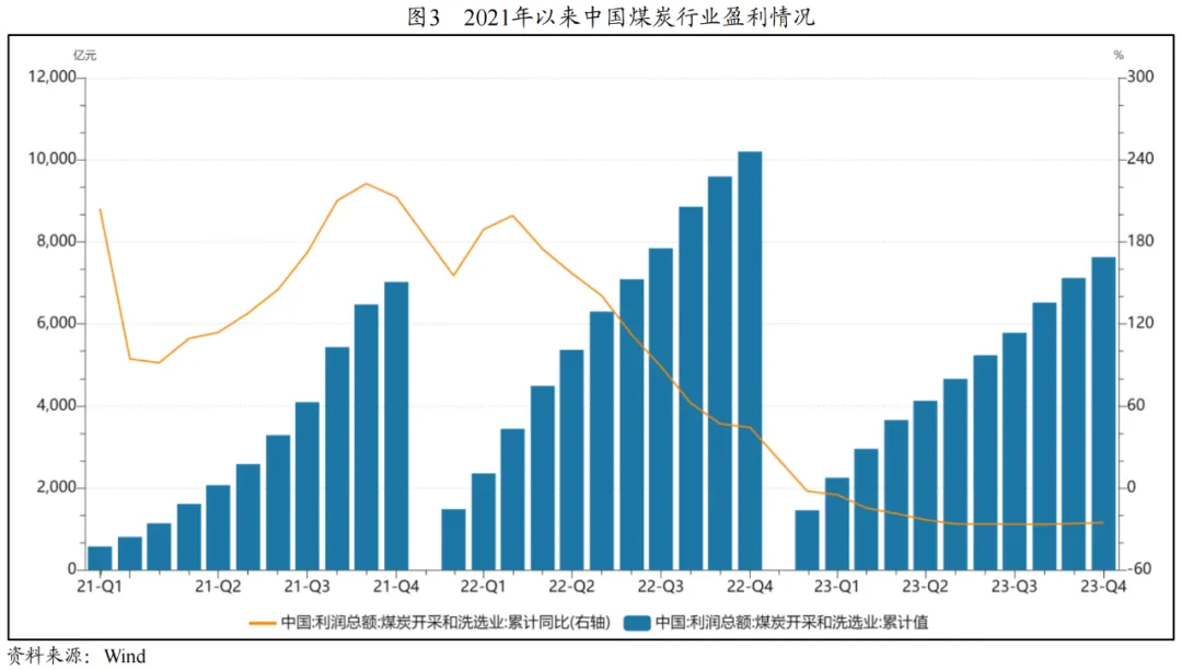 随着国家发改委指导价格的出台、长协签约率及履约率的提升,煤炭价格尤其是动力煤价格趋于稳定。2023年,煤炭供给量提升,但下游需求支撑不足,煤炭价格震荡回落,行业整体盈利水平有所下滑。2024年,煤炭市场供需有望保持平衡态势,煤炭价格将趋于稳定且可控,煤炭行业有望实现持续盈利。但非经营性负担对煤炭企业可持续发展带来压力,以及新能源快速发展对传统能源发展空间的挤压等对煤炭行业的影响仍需持续关注。