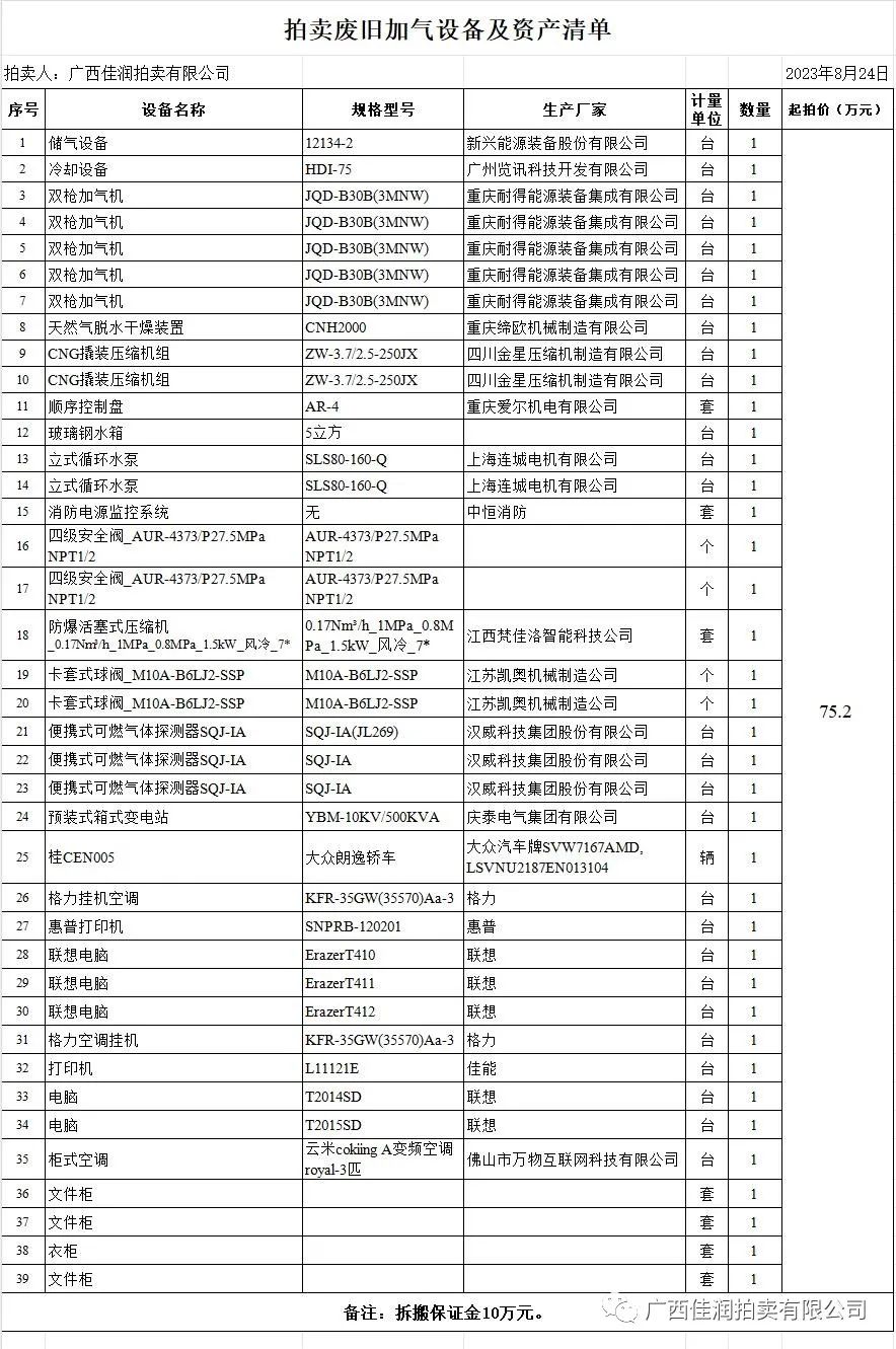 受委托,本公司定于2023年8月24日上午10时至12时止(延时的除外),在中拍平台对废旧加气设备及资产一批进行网络公开拍卖。整体起拍价:75.2万元(不含税),竞买保证金10万元。