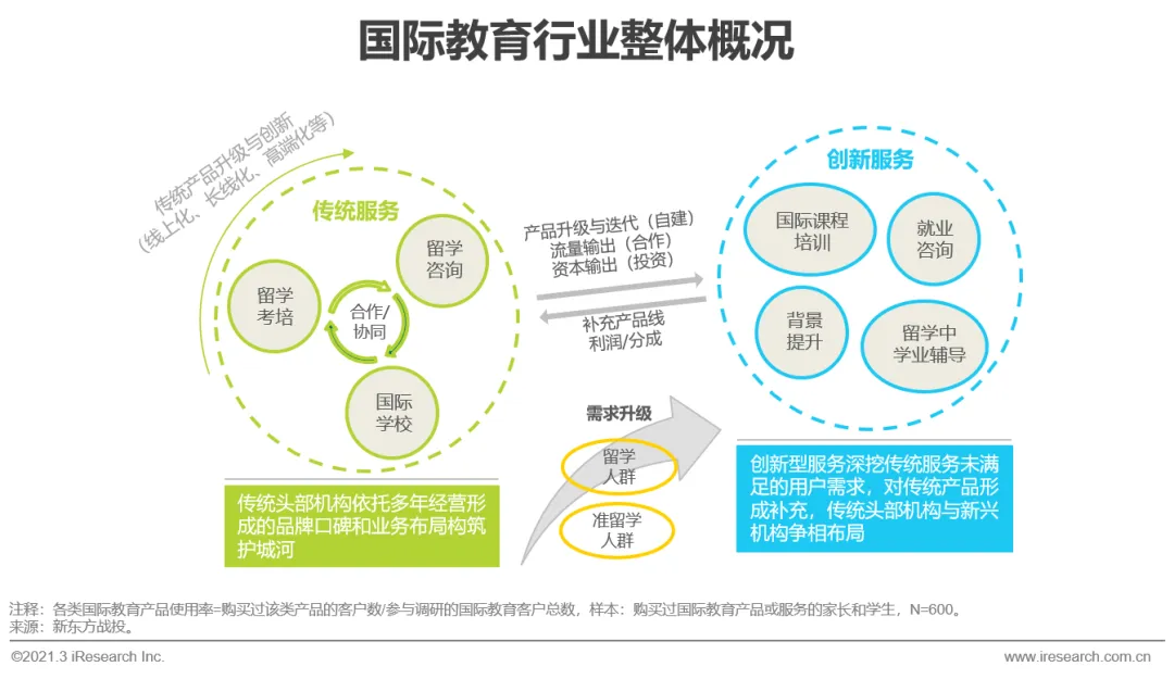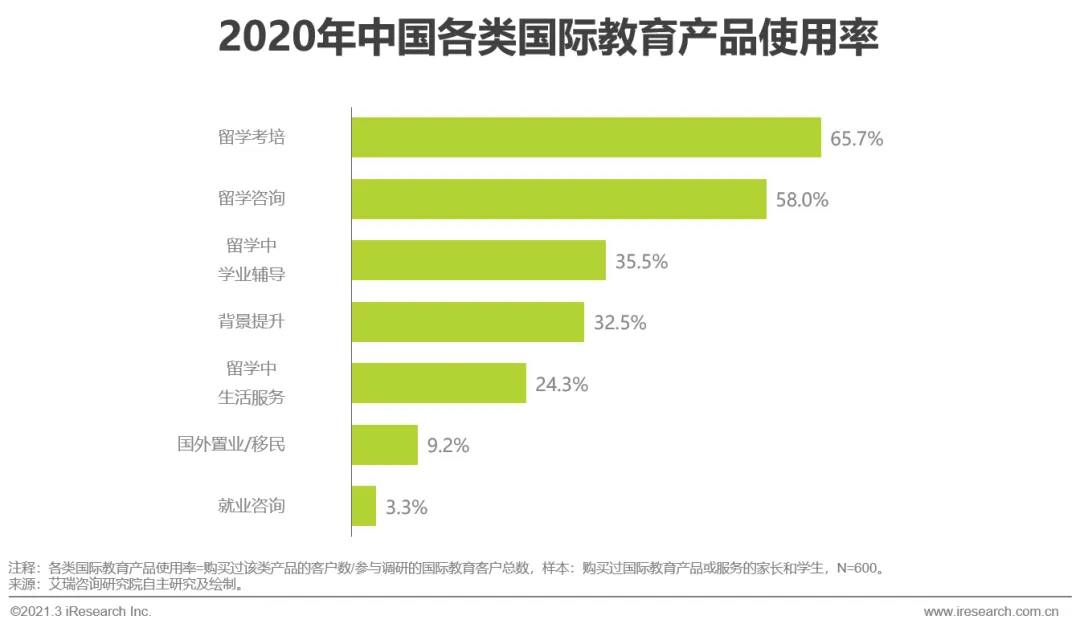 传统大型机构与新兴机构争相布局创新业务以迎合用户需求,国际教育行业生态近年日益丰富。此外,国际教育客户使用率最高的产品仍是留学考培、留学咨询,传统留学服务极具入口价值,同时留学中学业辅导、背景提升等创新服务也已形成一定的用户基础。