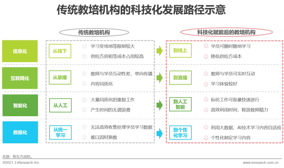 整体而言,传统教培机构的科技化路径主要从信息化、互联网化、智能化和数据化等方面进行全面的提升和转变。