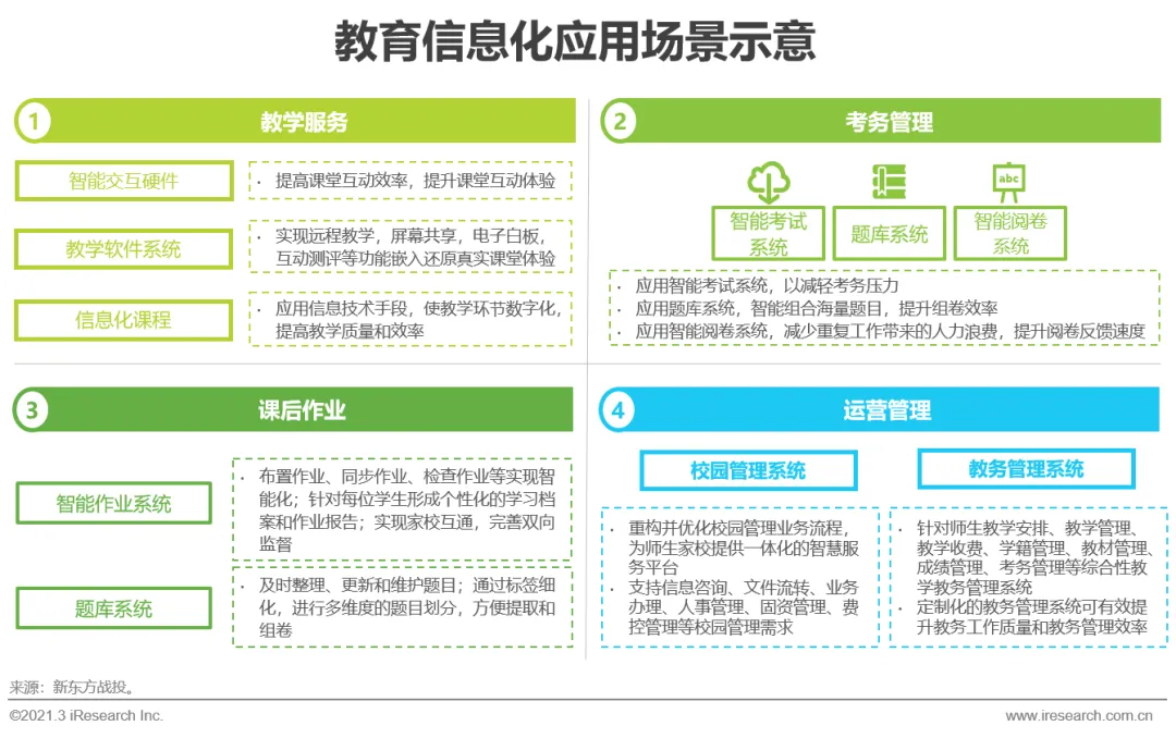 教育信息化公司通常选择公立校或教培机构切入,对接G端、B端需求,其产品应用场景包括智能教学、考试系统、作业处理与校园管理等。
