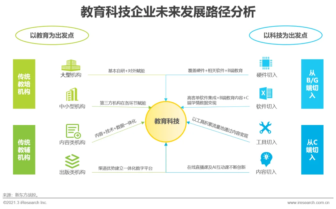 教育科技:传统教培机构的科技化路径主要从信息化、互联网化、智能化和数据化等方面进行全面的提升和转变,旨在从教育升级为教育科技;在线教育企业多从工具产品向内容服务转变,对接C端的需求,教育信息化公司通常选择公立校或教培机构切入,对接G端、B端需求,旨在从科技升级为教育科技。